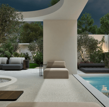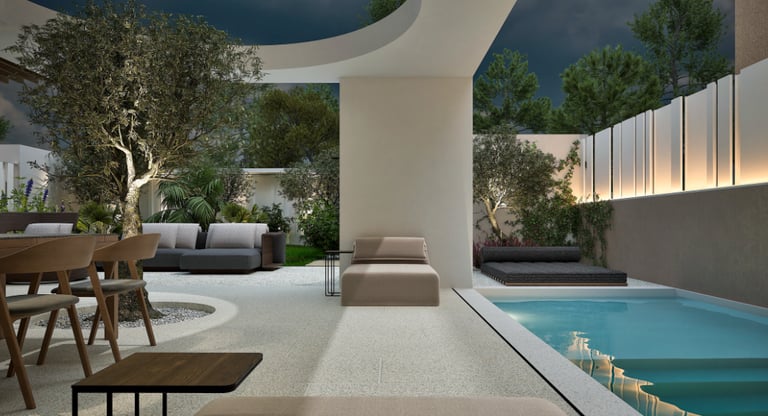 Έχει δοθεί και μεγάλη έμφαση στα καλοπιστικά φυτά του κήπου καθώς περιβάλλεται από δέντρα, υπάρχει χλοοτάπητας φυσικός καθώς και πισίνα 26τμ που συμβάλουν κατά πολύ στη διατήρηση της θερμοκρασίας σε χαμηλότερα επίπεδα. (Μελέτες αναφέρουν ότι ο συνδυασμός δεντροφύτευσης/ γκαζόν και πισίνας προσφέρουν 4-6 βαθμούς χαμηλότερη θερμοκρασία κατά τους ζεστούς μήνες)